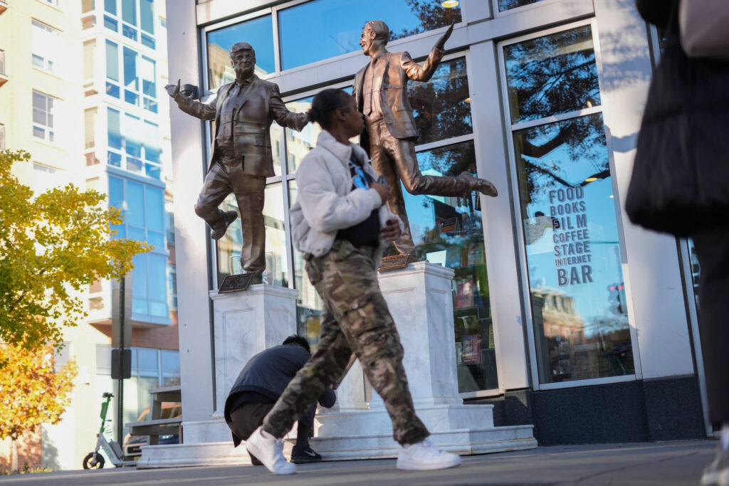 Protest art representing President Donald Trump and Jeffrey Epstein sits outside Busboys and Poets restaurant in the U Street neighborhood of Washington, Thursday, Nov., 13, 2025. (AP Photo/Pablo Martinez Monsivais)