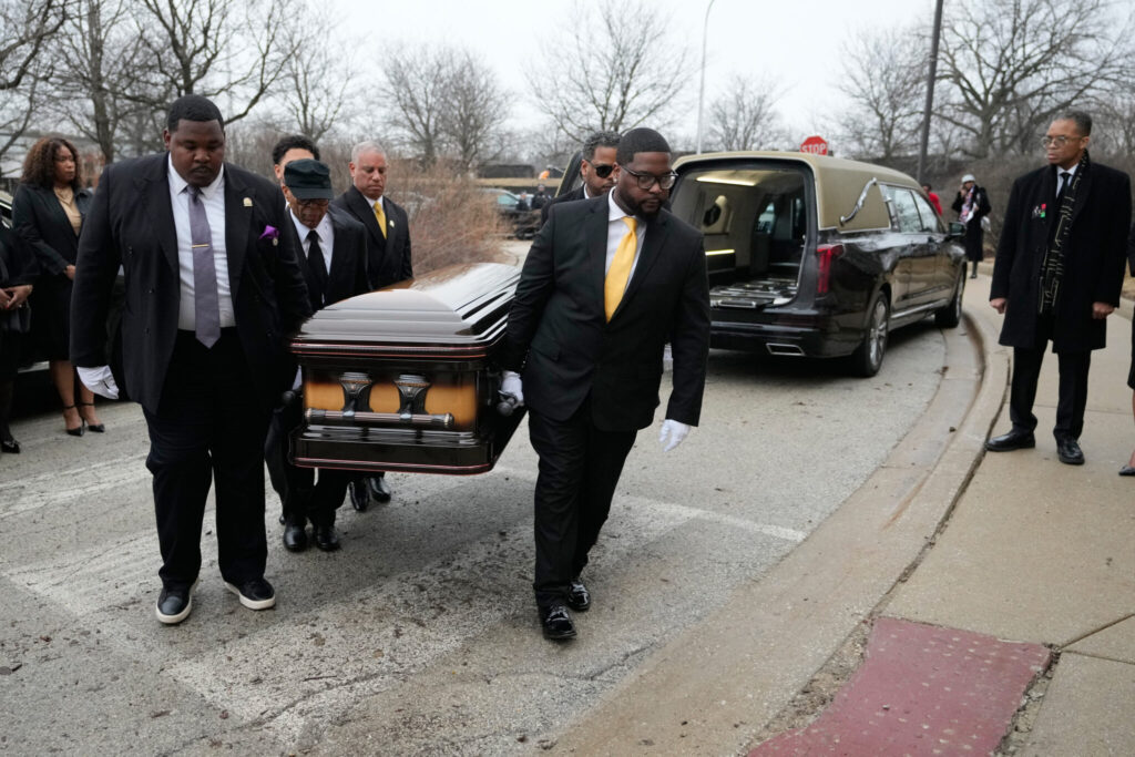 The casket with the Rev. Jesse Jackson arrives for the Public Homegoing Service at the House of Hope in Chicago, Friday, March 6, 2026. (AP Photo/Nam Y. Huh)