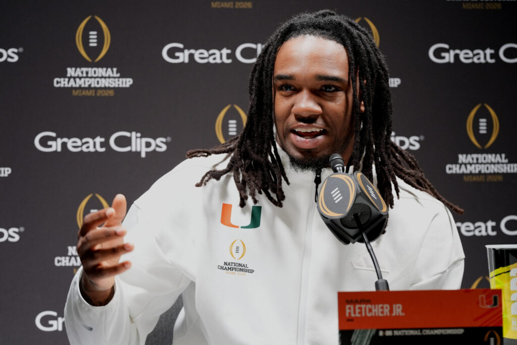 Miami running back Mark Fletcher Jr. speaks during media day ahead of the College Football Playoff national championship game between Miami and Indiana, Saturday, Jan. 17, 2026, in Miami. (AP Photo/Marta Lavandier)