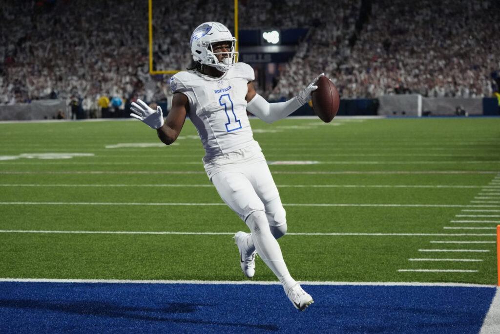 Buffalo Bills wide receiver Curtis Samuel (1) scores a touchdown on a catch and run against the New England Patriots during the second half of an NFL football game, Sunday, Sept. 5, 2025, in Orchard Park, N.Y. (AP Photo/Gene J. Puskar)