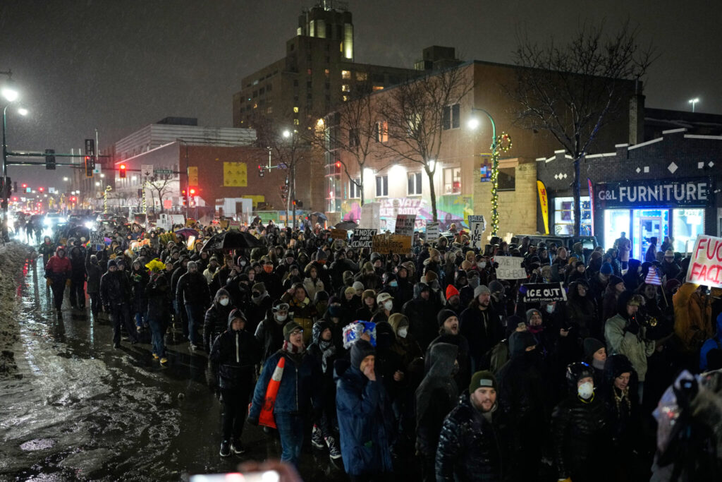 Renee Good, a 37-year-old mother of three, was fatally shot Wednesday by an Immigration and Customs Enforcement officer in Minneapolis as she attempted to flee a traffic stop. Her death triggered immediate protests in the city, including a march through icy rain Thursday night, with demonstrators chanting “ICE out now!” and carrying signs reading, “Killer ICE off our streets.” A spontaneous shrine near the site of the shooting was preserved as city workers cleared barricades from the surrounding area.