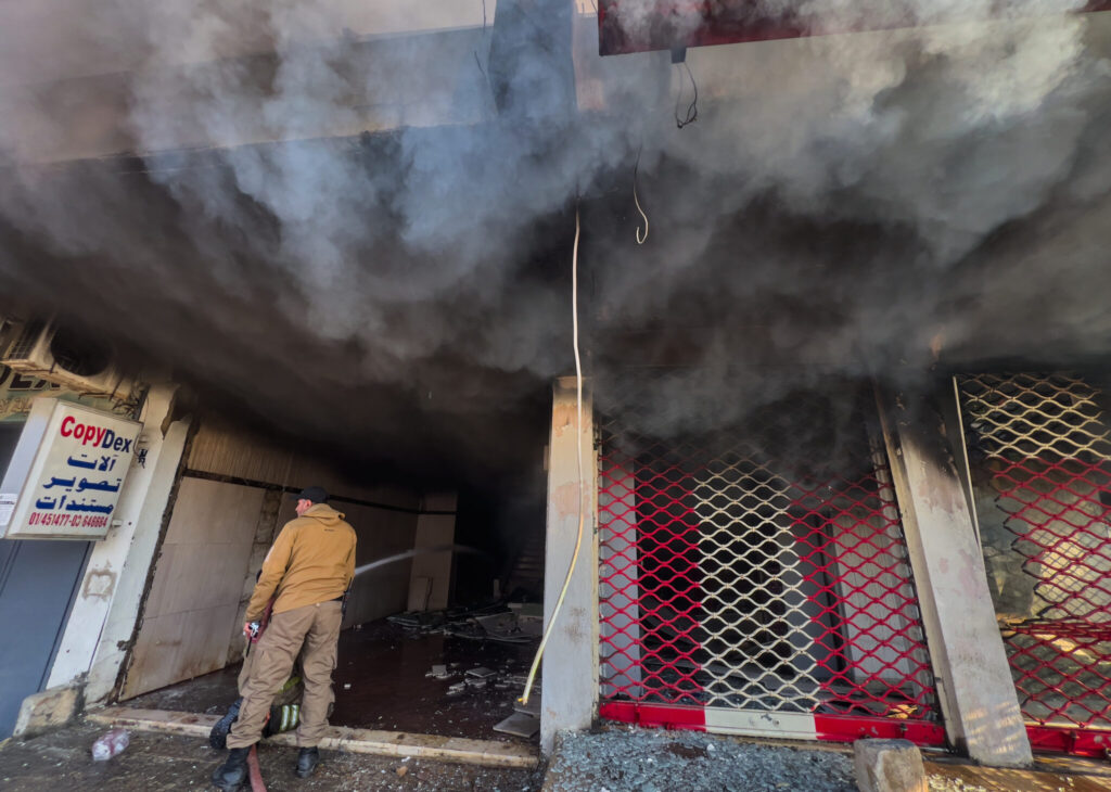 A firefighter extinguishes fire at a building that was hit by an Israeli airstrike in Dahiyeh, a southern suburb of Beirut, Lebanon, Tuesday, March 3, 2026. (AP Photo/Hussein Malla)