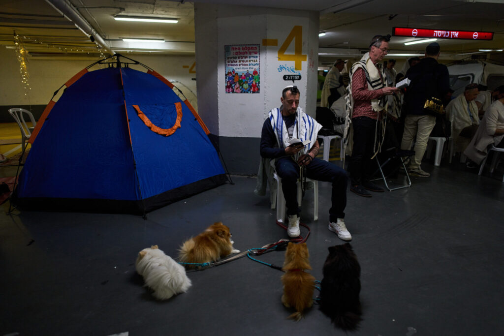 Jewish men covered in prayer shawls pray in an underground parking garage as a precaution against possible Iranian missile attacks, in Tel Aviv, Israel, Tuesday, March 3, 2026. (AP Photo/Oded Balilty)