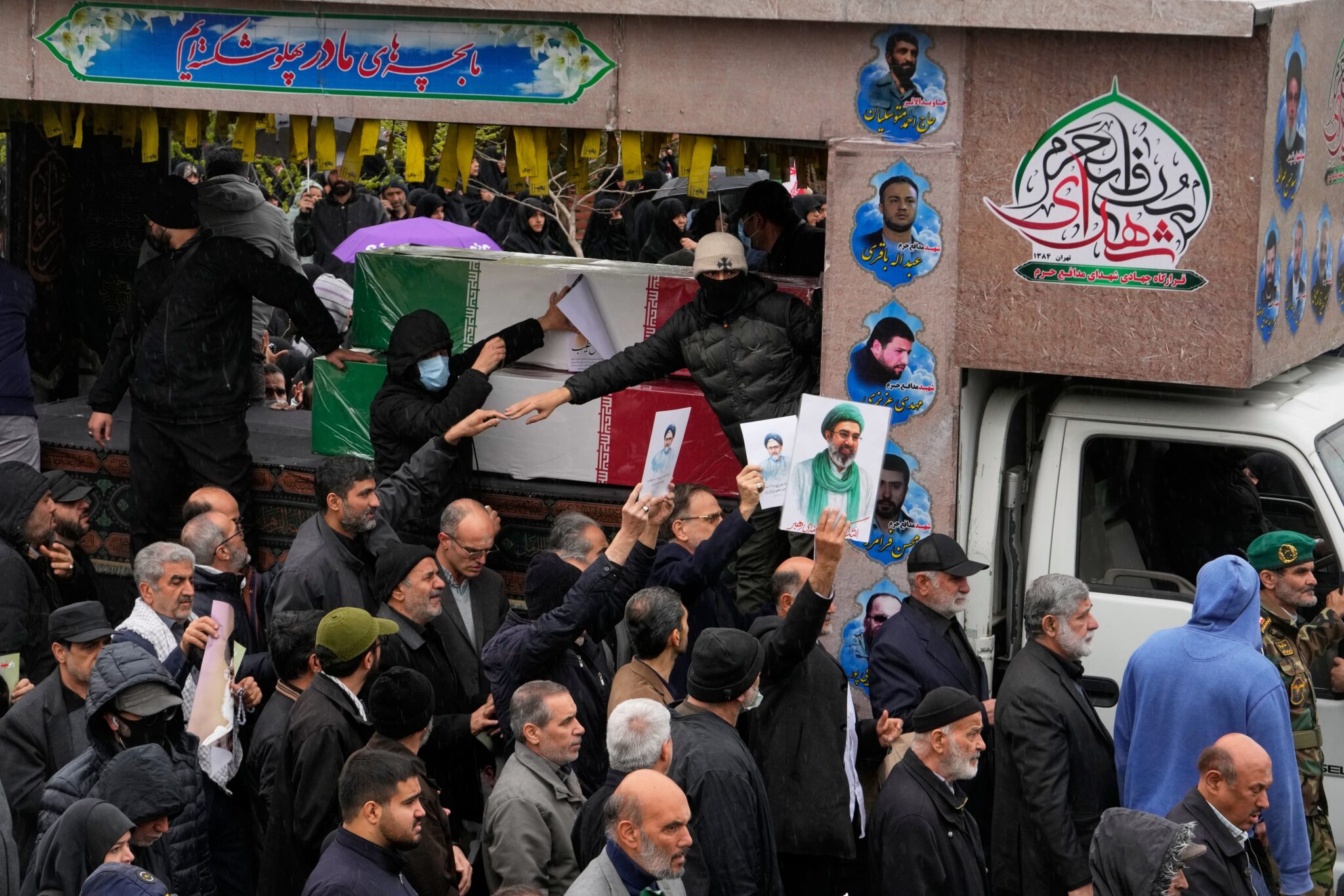 Iranians reach toward the coffins as they follow the funeral procession of Iran’s intelligence minister Esmail Khatib and, according to Iranian officials, his wife and daughter, in Tehran, Iran, Friday, March 20, 2026. (AP Photo/Vahid Salemi)
