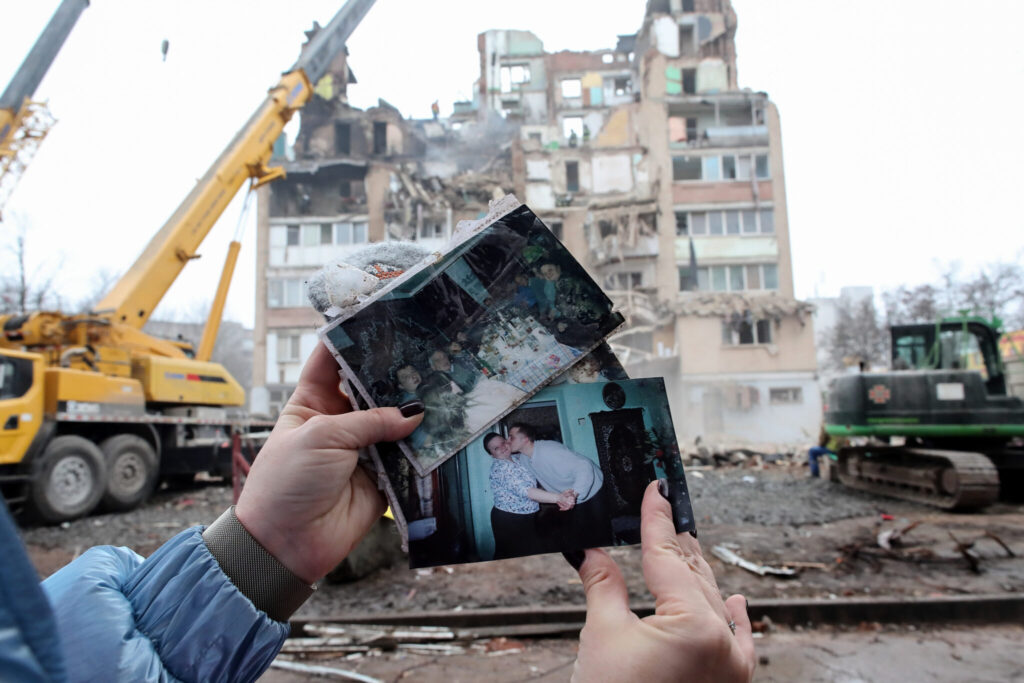 A woman looks on family photographs in front of a residential building which was heavily damaged by a Russian strike on Ternopil, Ukraine, Friday, Nov. 21, 2025. (AP Photo/Vlad Kravchuk)