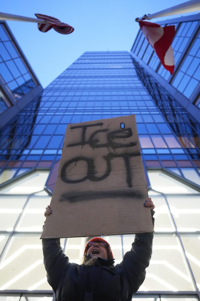 A demonstrator holds a sign reading “ICE OUT” during a protest outside the office of Sen. Amy Klobuchar, D-Minn., on Monday, Jan. 26, 2026, in Minneapolis. (AP Photo/Adam Gray)