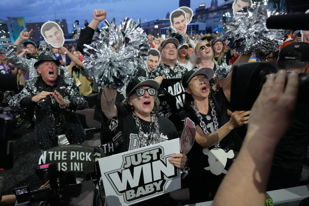 Las Vegas Raiders fans celebrate after Indiana quarterback Fernando Mendoza was chosen by the Las Vegas Raiders with the first overall pick during the first round of the NFL football draft, Thursday, April 23, 2026, in Pittsburgh. (AP Photo/Sue Ogrocki)