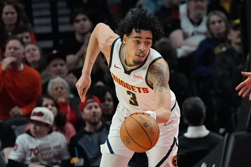 Denver Nuggets guard Julian Strawther (3) goes for the ball during the first half of an NBA basketball game against the Portland Trail Blazers, Friday, Feb. 20, 2026, in Portland, Ore. (AP Photo/Jenny Kane)