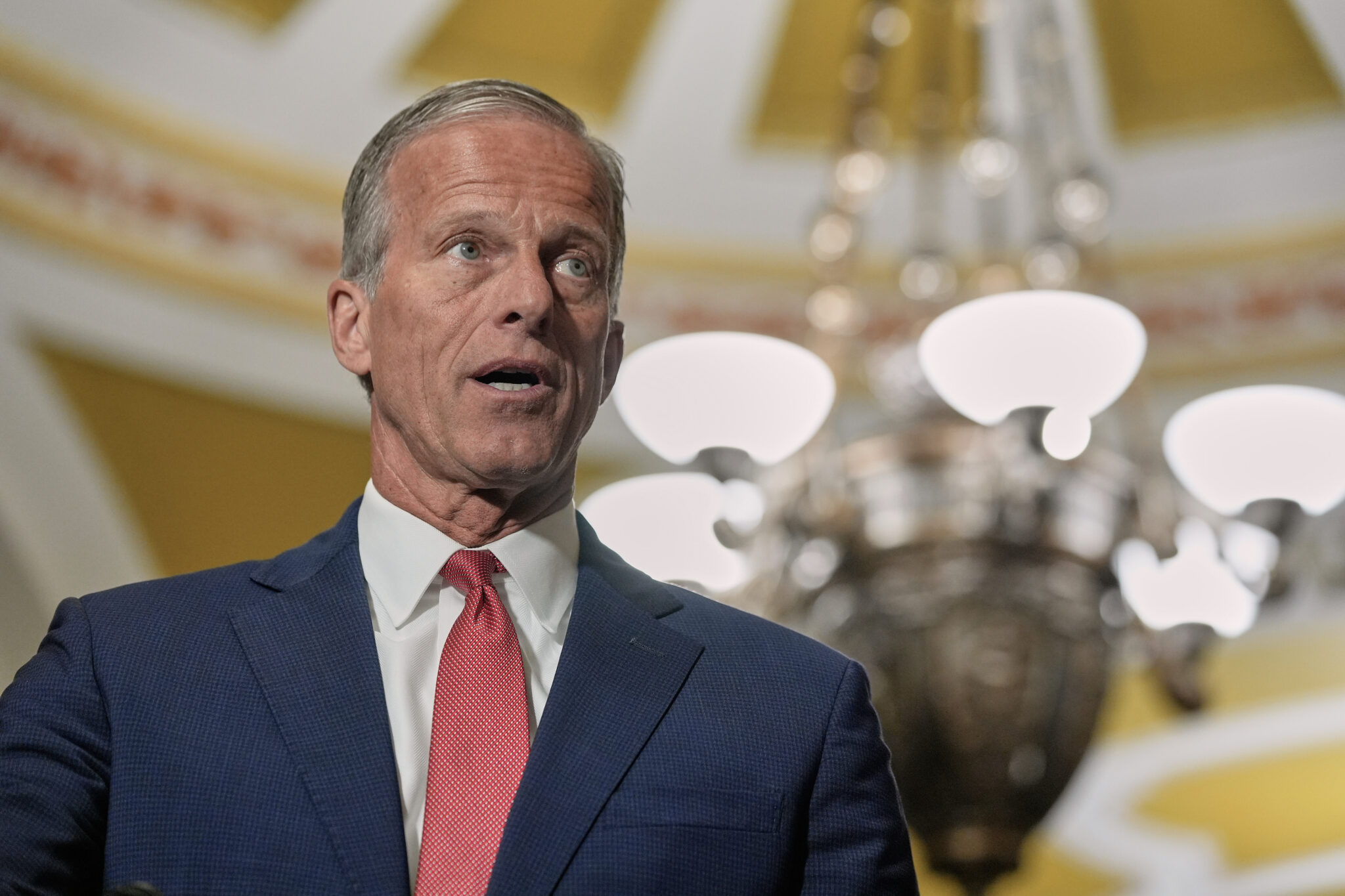Senate Majority Leader John Thune, R-S.D., speaks with reporters following a closed-door meeting of Senate Republicans on day 28 of the government shutdown, at the Capitol in Washington, Tuesday, Oct. 28, 2025. (AP Photo/J. Scott Applewhite)
