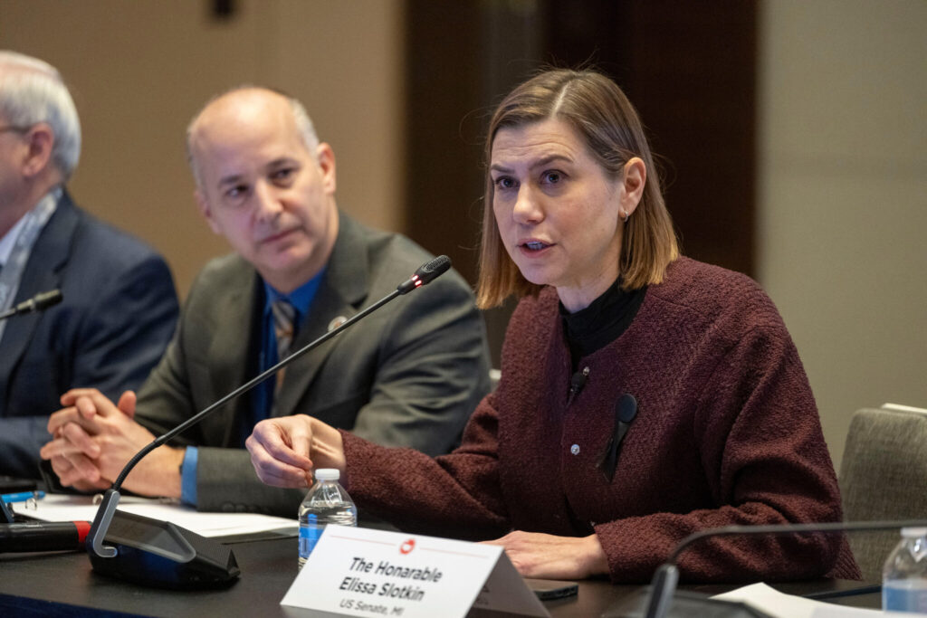 Sen. Elissa Slotkin, D-Mich., talks during a breakout session during the 94th Winter Meeting of the U.S. Conference of Mayors, Wednesday, Jan. 28, 2026 in Washington. (AP Photo/Kevin Wolf)