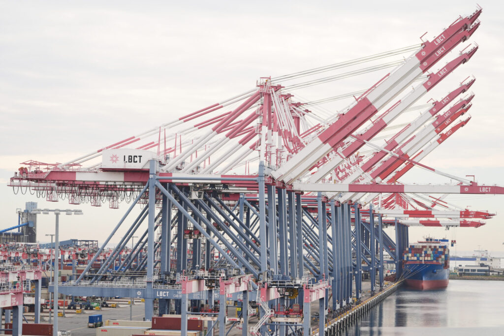 A container ship is docked at the Port of Long Beach Friday, Feb. 20, 2026, in Long Beach, Calif. (AP Photo/Damian Dovarganes)