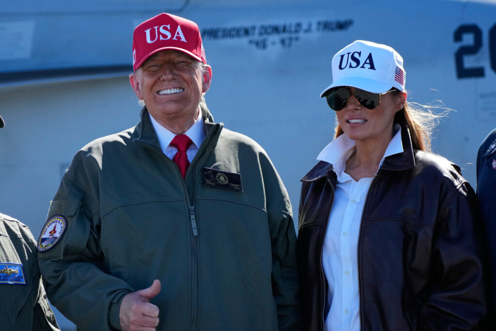 President Donald Trump and first lady Melania Trump pose in front of a F/A-18E fighter jet with President Donald Trump’s name on it, as part of the Navy’s 250th anniversary celebration, aboard the USS George H.W. Bush aircraft carrier in the Atlantic Ocean off the coast of Norfolk, Va., Sunday, Oct. 5, 2025. (AP Photo/Alex Brandon)