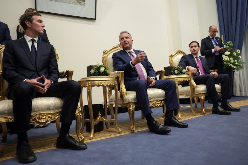 U.S. Special Envoy to the Middle East Steve Witkoff speaks next to Jared Kushner and U.S. Secretary of State Marco Rubio in Sharm El-Sheikh, Egypt, October 13, 2025.