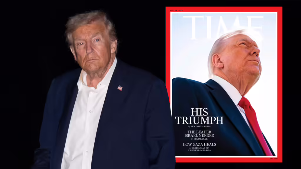 Trump Slams Time Magazine Over Peace Deal Cover ‘Worst Photo Ever’/ Newslooks/ WASHINGTON/ WASHINGTON/ J. Mansour/ Morning Edition/ President Trump criticized Time magazine for using what he called an unflattering photo on its cover despite the feature praising his Middle East peace deal as a triumph. The image, showing a crown-like glare over his head and missing his signature hairstyle, provoked mockery from the president. The cover accompanied Time’s recognition of his Gaza ceasefire deal as a major foreign policy success.