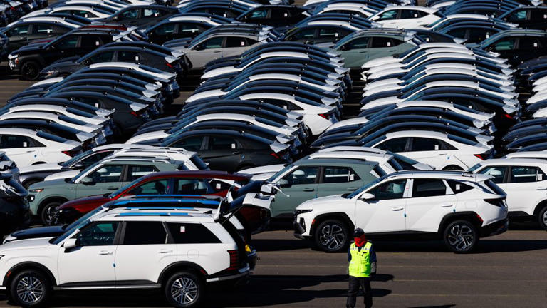 Hyundai Motor Co. vehicles bound for export await shipment at a port near the company’s plant in Ulsan, South Korea.