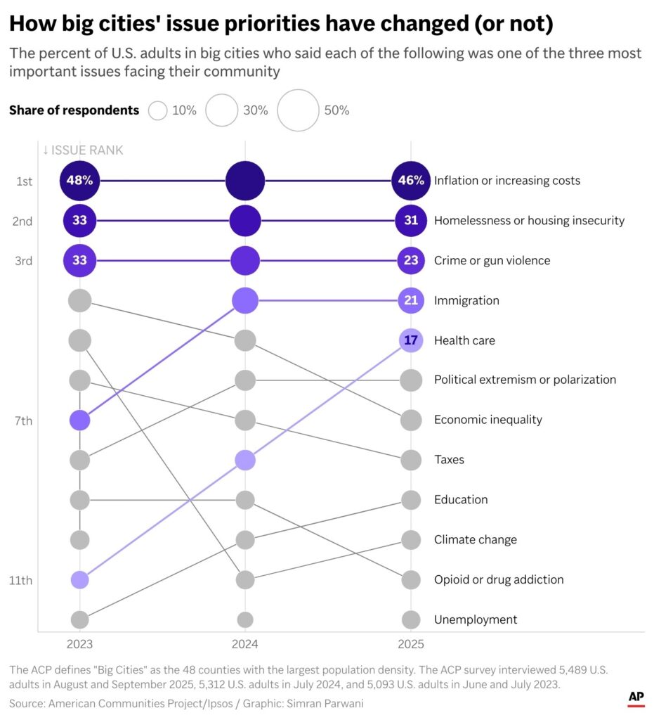 - Crime worries have dropped in large cities, contradicting national rhetoric.