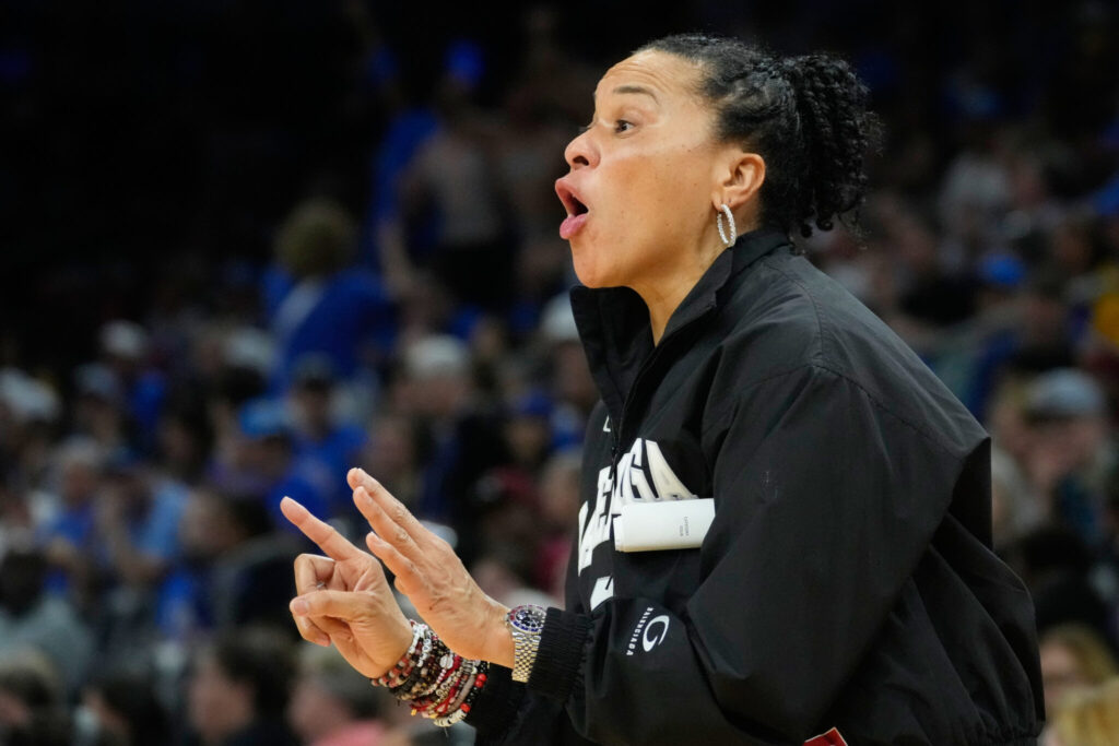 South Carolina head coach Dawn Staley motions towards the court against UCLA during the second half of the women’s National Championship Final Four NCAA college basketball tournament game, Sunday, April 5, 2026, in Phoenix. (AP Photo/Ross D. Franklin)