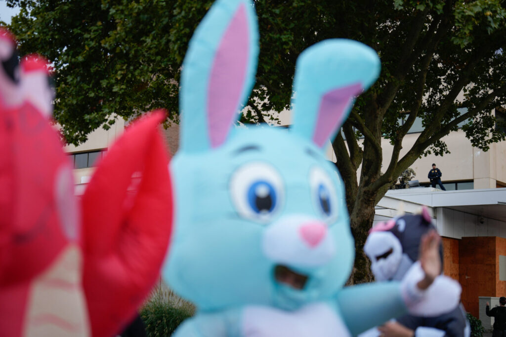 People wearing costumes protest outside a U.S. Immigration and Customs Enforcement facility, at right, on Saturday, Oct. 11, 2025, in Portland, Ore. (AP Photo/Jenny Kane)