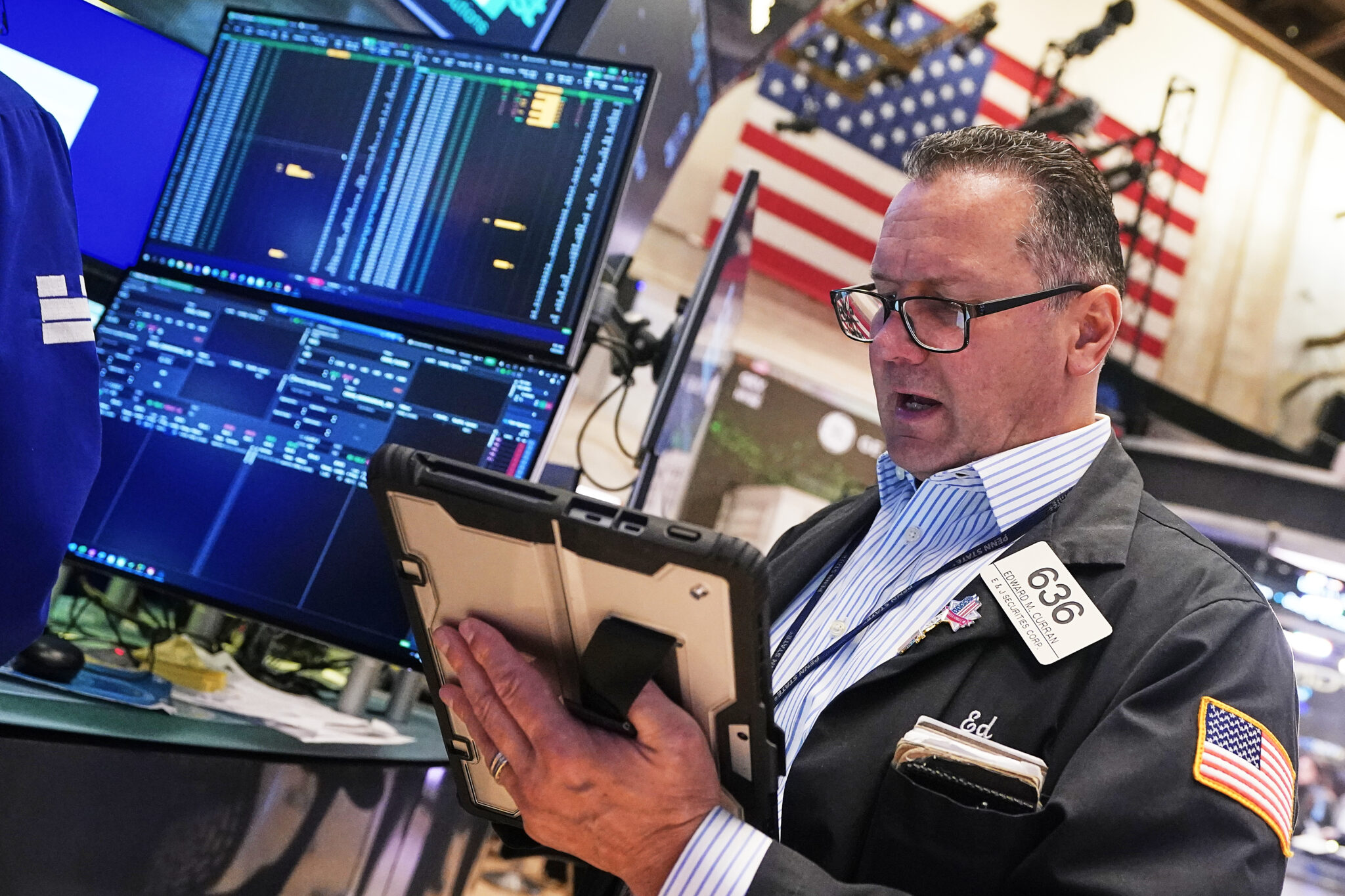People work on the floor at the New York Stock Exchange in New York, Monday, April 13, 2026. (AP Photo/Seth Wenig)